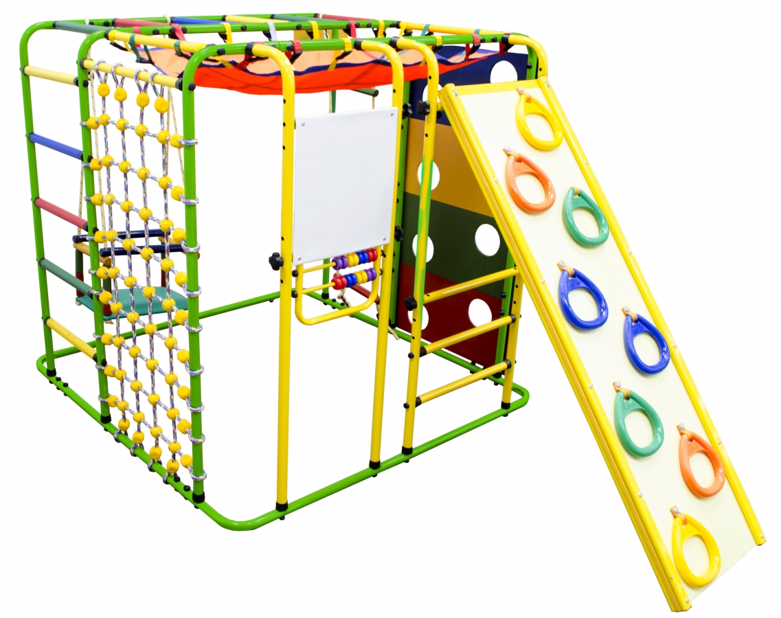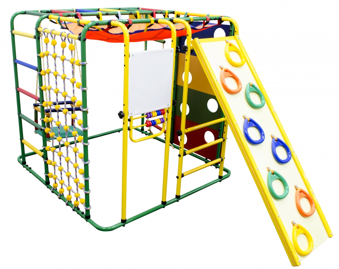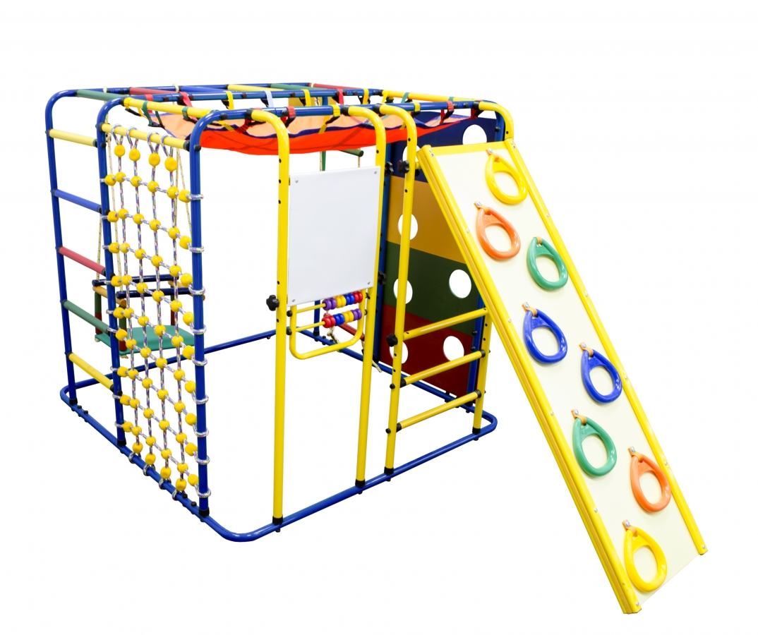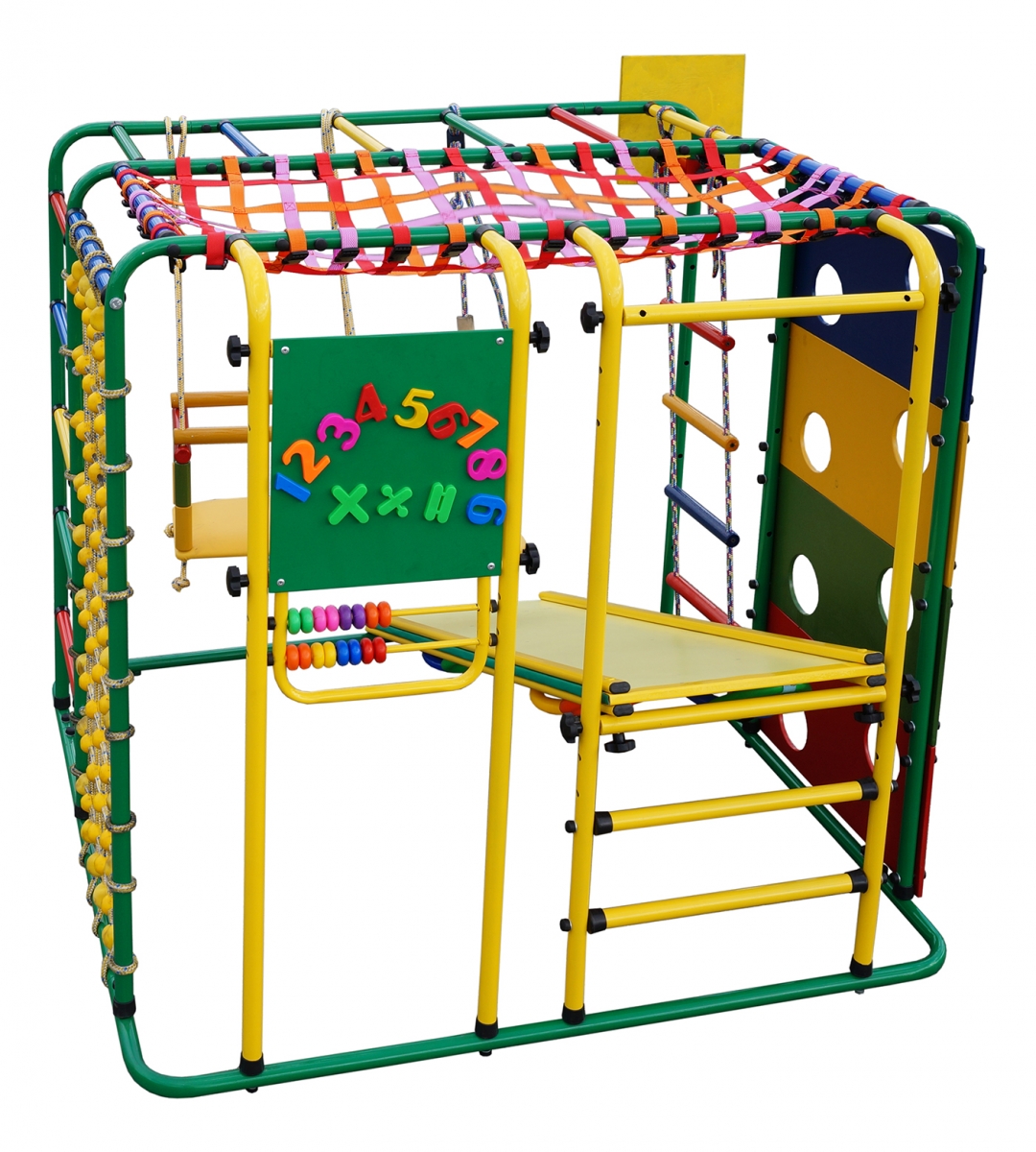 | Комплектация | качели, тарзанка, сетка-гамак, кольцо для мяча, сетка для лазанья, счёты и мольберт, верёвочная лестница, панель с отверстиями, горка-скалодром с кольцами |