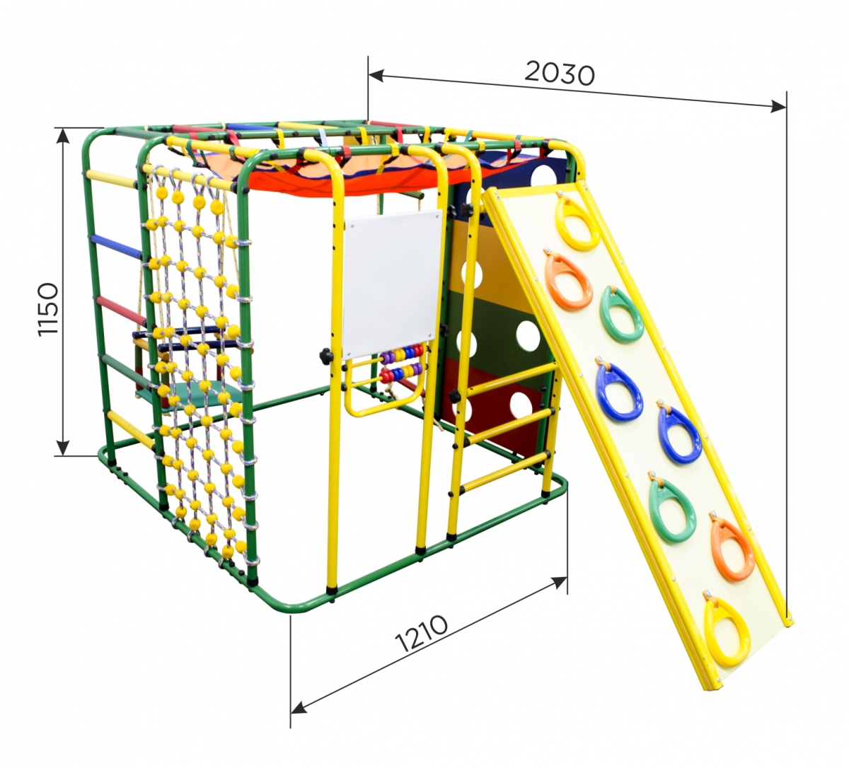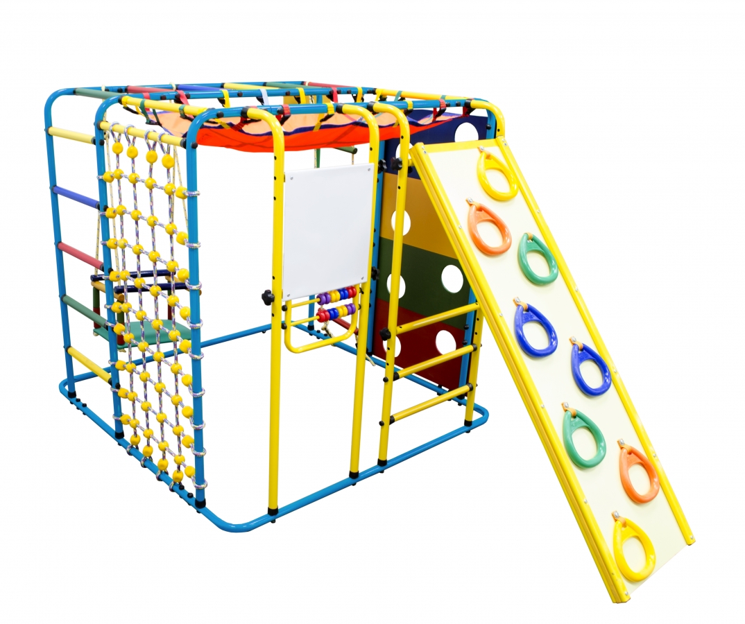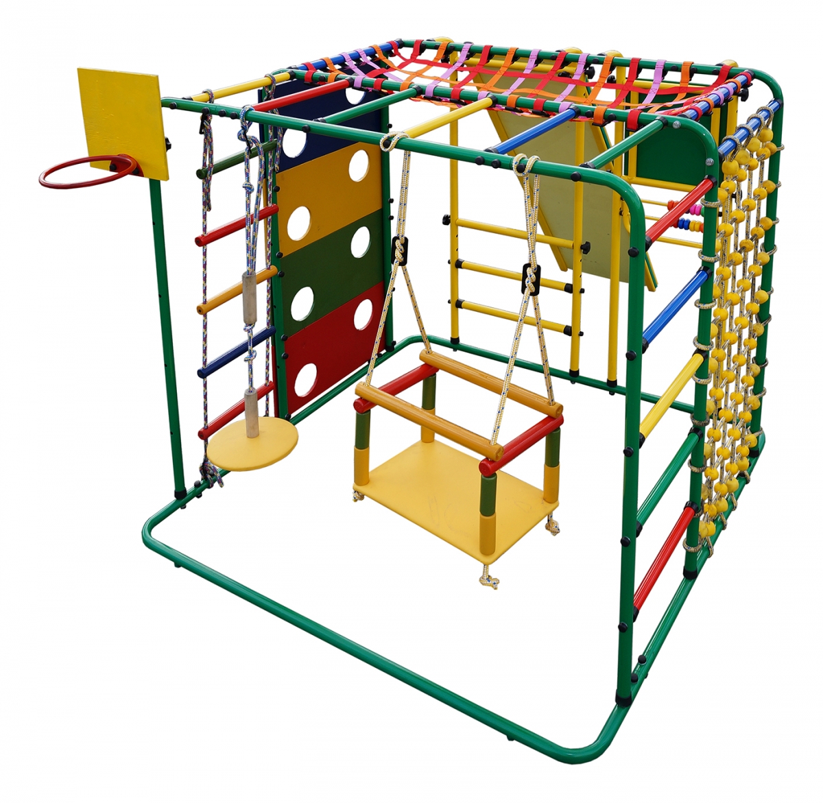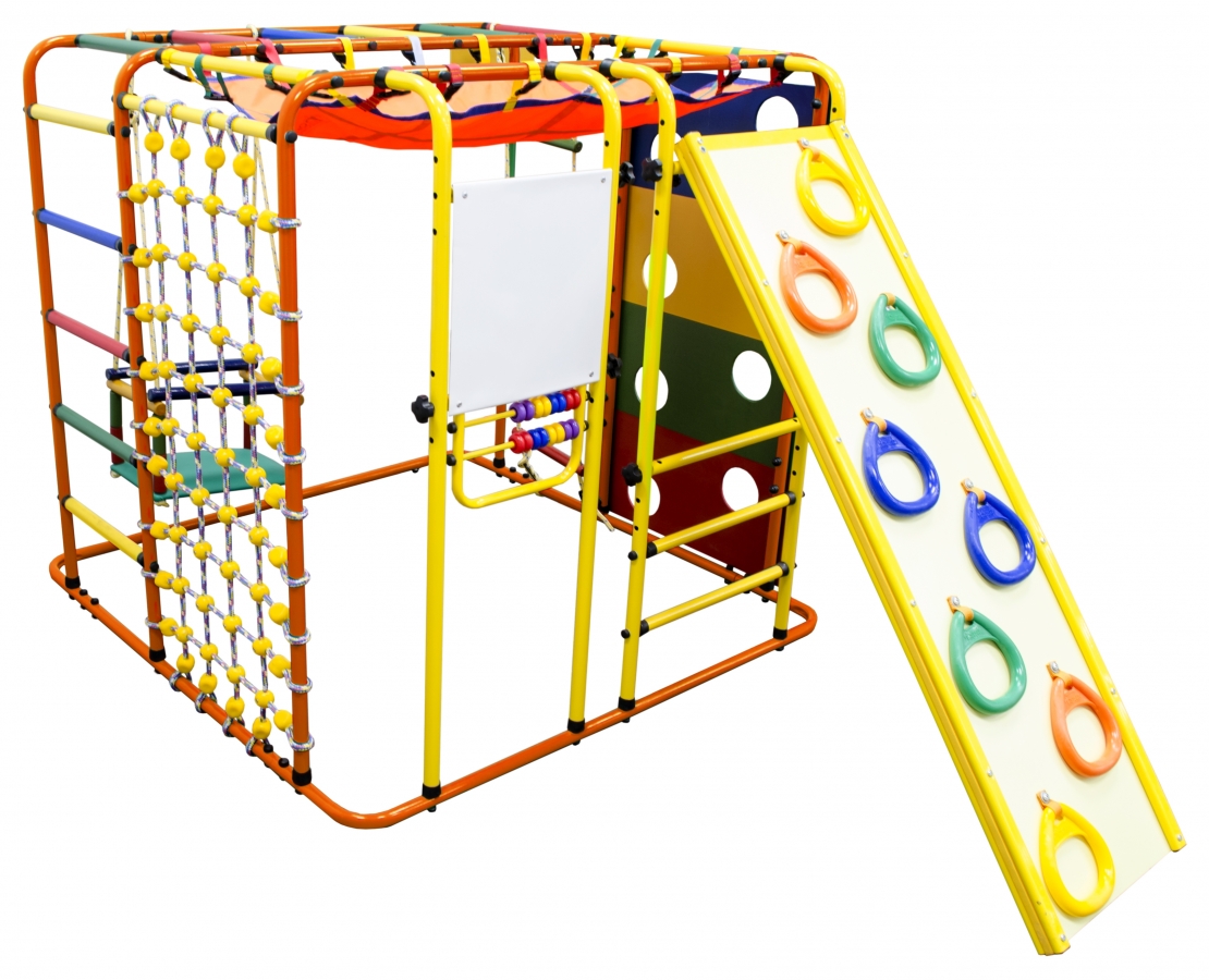 | Комплектация | качели, тарзанка, сетка-гамак, кольцо для мяча, сетка для лазанья, счёты и мольберт, верёвочная лестница, панель с отверстиями, горка-скалодром с кольцами |