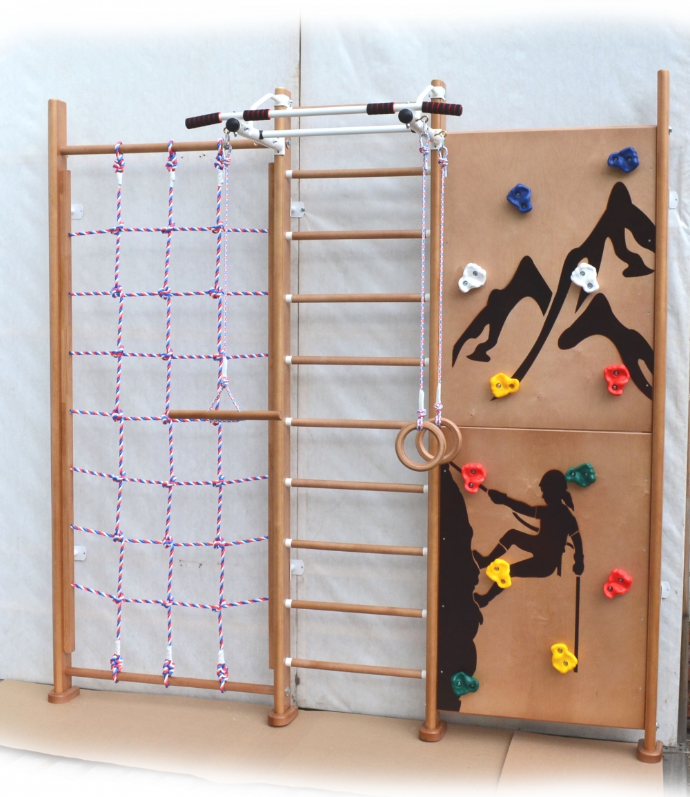 Домашний спортивный комплекс Alexander состоит из трех элементов: шведская стенка, детский - домашний скалодром и гладиаторская сетка для лазания. К шведской стенке крепится турник выдерживающий нагрузку до 120 килограмм, что позволяет заниматься на комплексе и взрослому человеку. К турнику крепится навесное оборудование: канат, гимнастические кольца и тарзанка.