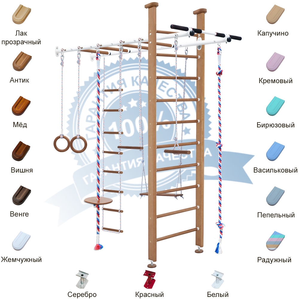 Шведская стенка с рукоходом Flora включающая в себя турник, кольца гимнастические, канат, тарзанку, веревочную лестницу, качели, трапецию и лиану - предназначена для укрепления всех групп мышц Вашего ребенка, развития координации, ловкости, тренировки вестибулярного аппарата и формирования навыков правильной осанки. Шведская стенка Flora превратит домашний досуг в увлекательную игру, а Вы можете быть полностью уверены в безопасности своего ребенка. Крепится комплекс к стене и враспор между полом и потолком.