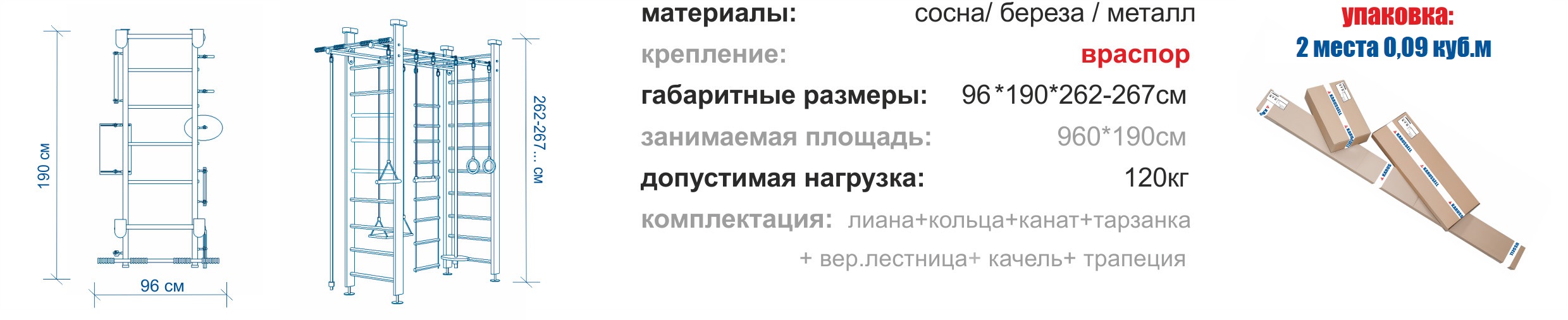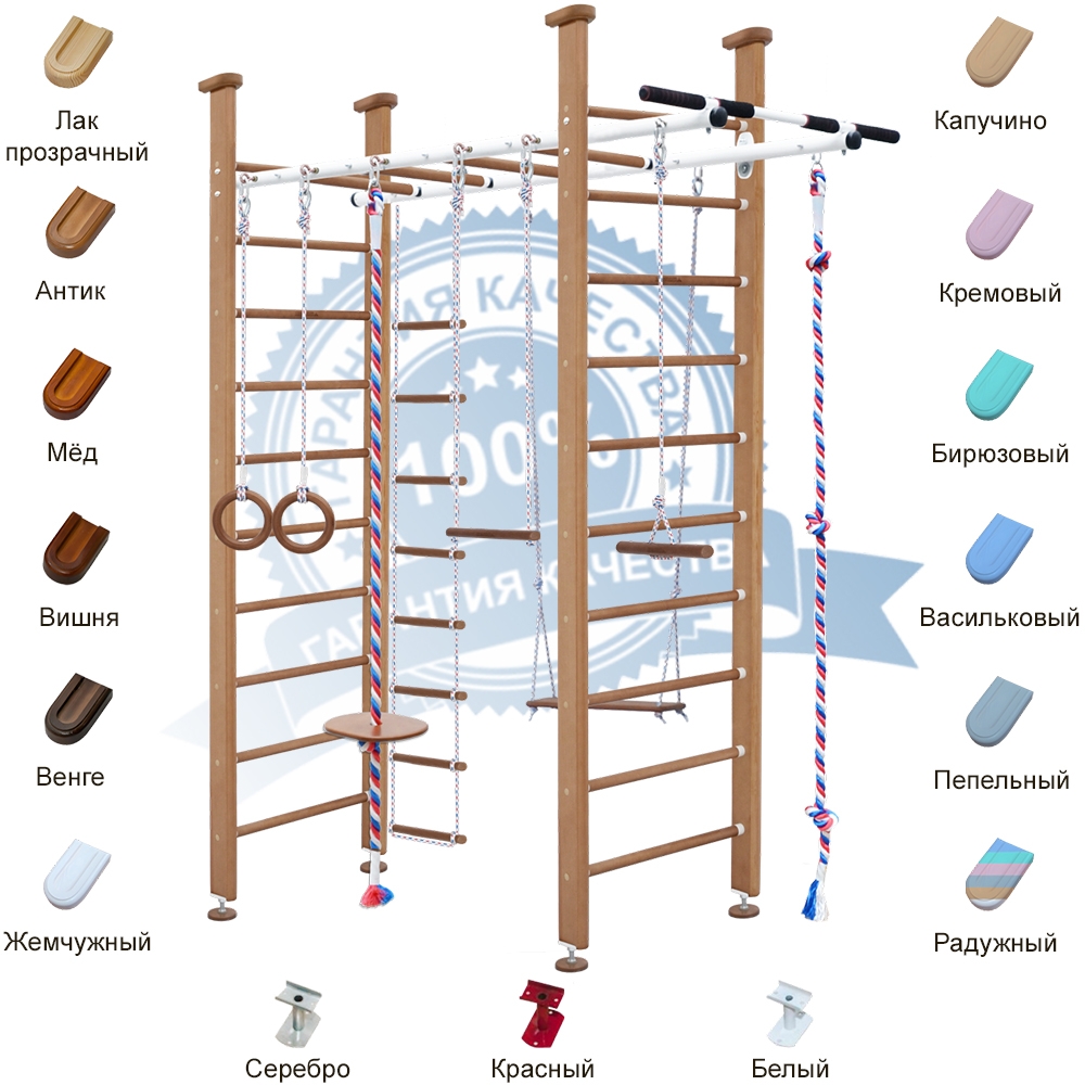 | Комплектация навесного оборудования | Рукоход с турником, кольца гимнастические, канат, тарзанка, веревочная лестница, трапеция, лиана. |