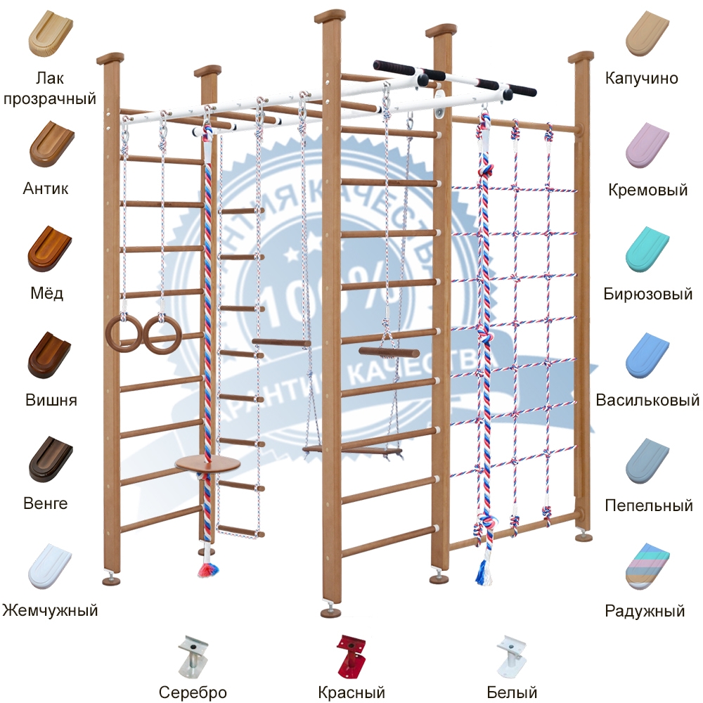 Спортивный уголок в квартиру Henrietta состоящий из двух шведских стенок с рукоходом и включающий в себя полный спектр навесного оборудования: канат, тарзанка, качели, трапеция, лиана, гимнастические кольца, веревочная лестница и сеть для лазания, гармонично организует пространство, предназначенное для физических упражнений вашего ребенка в домашних условиях.