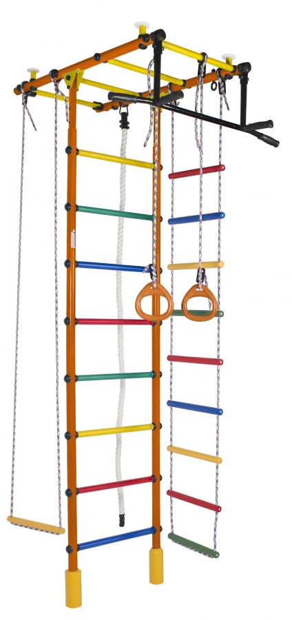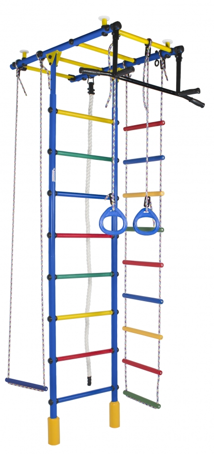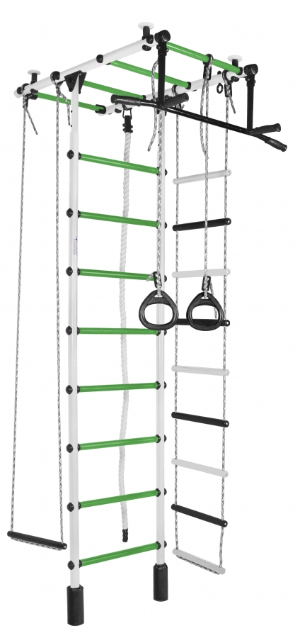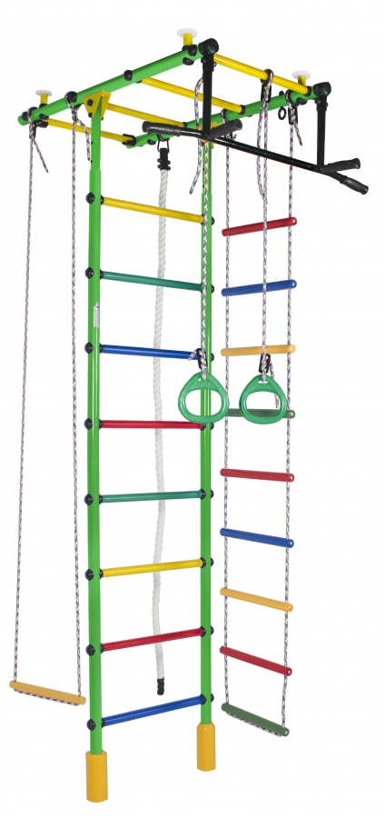 - Турник-перекладина. Основной элемент комплекса, развивающий силу и выносливость. И это снаряд, доступный взрослым: подтягивайтесь, укрепляйте пресс или просто висите на нём, чтобы не болела спина. Чтобы снизить скольжение и повысить удобство хвата, на рукоятки нанесён специальный узор, разработанный Формулой Здоровья