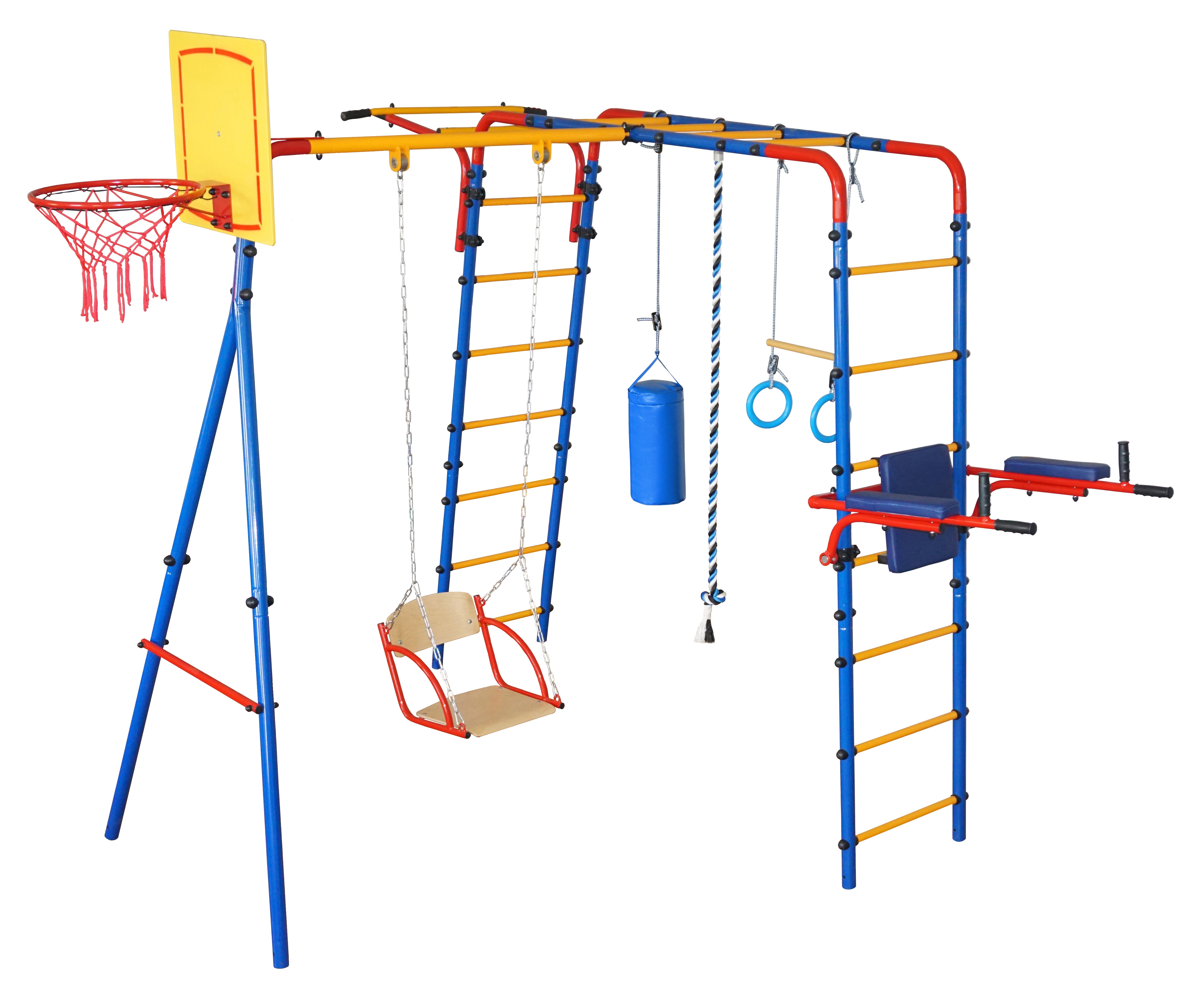 Комплектация: - Качели (цепной подвес, подшипниковая опора), кольца с перекладиной, канат трехцветный, турник регулируемый, брусья откидные со спинкой, баскетбольное кольцо со щитом и сеткой, груша боксерская детская.