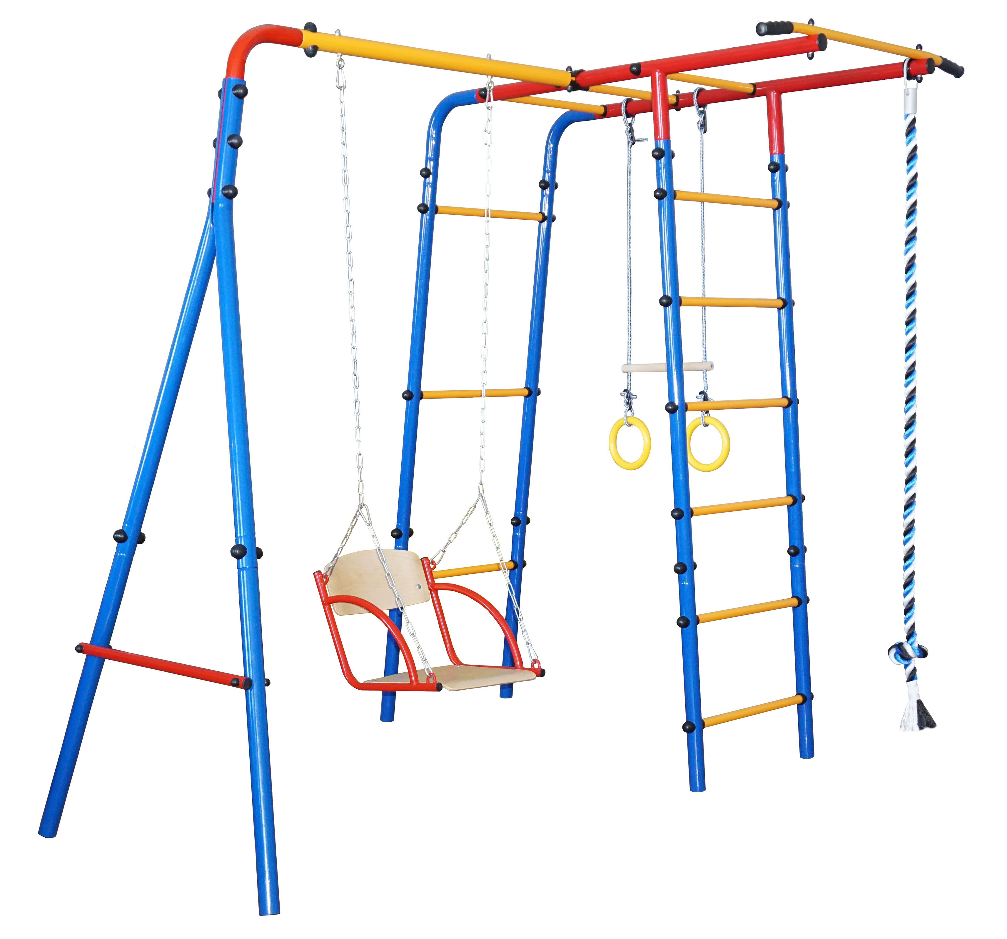 Комплектация: - Качели (цепной подвес, без подшипниковая опора), кольца с перекладиной, канат трехцветный, турник.
