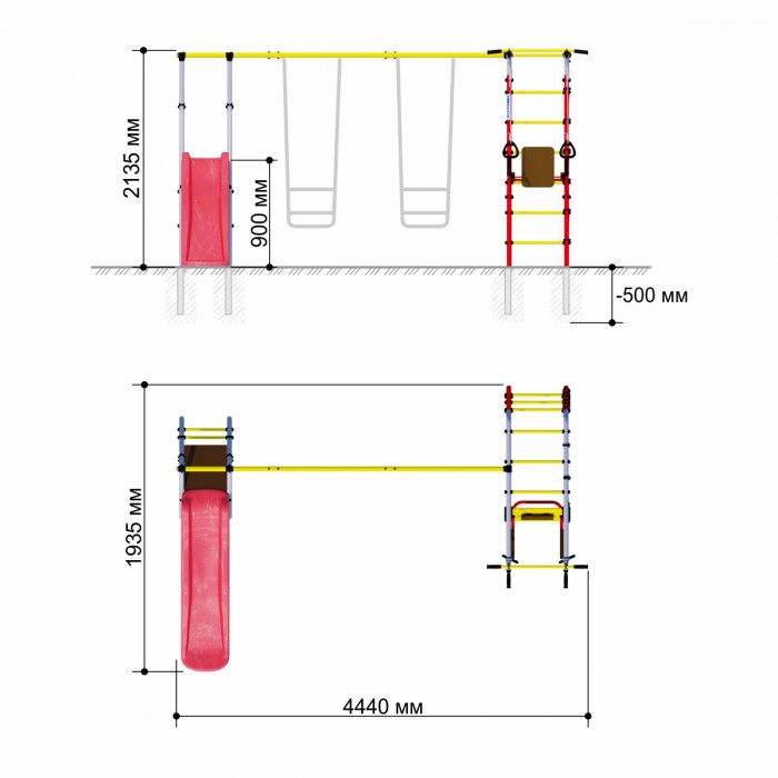 В дачном комплексе предусмотрена удобная и безопасная горка, рядом с которой располагаются качели. Другая часть комплекса состоит из лестницы и турника, а также канатного лаза, сделанного из шнура повышенной прочности. В комплекте также предусмотрены гимнастические кольца. Все навесное оборудование выполнено из атмосферостойких материалов — в летнее время их можно не убирать в дом после занятий. Приключения обещают быть захватывающими!