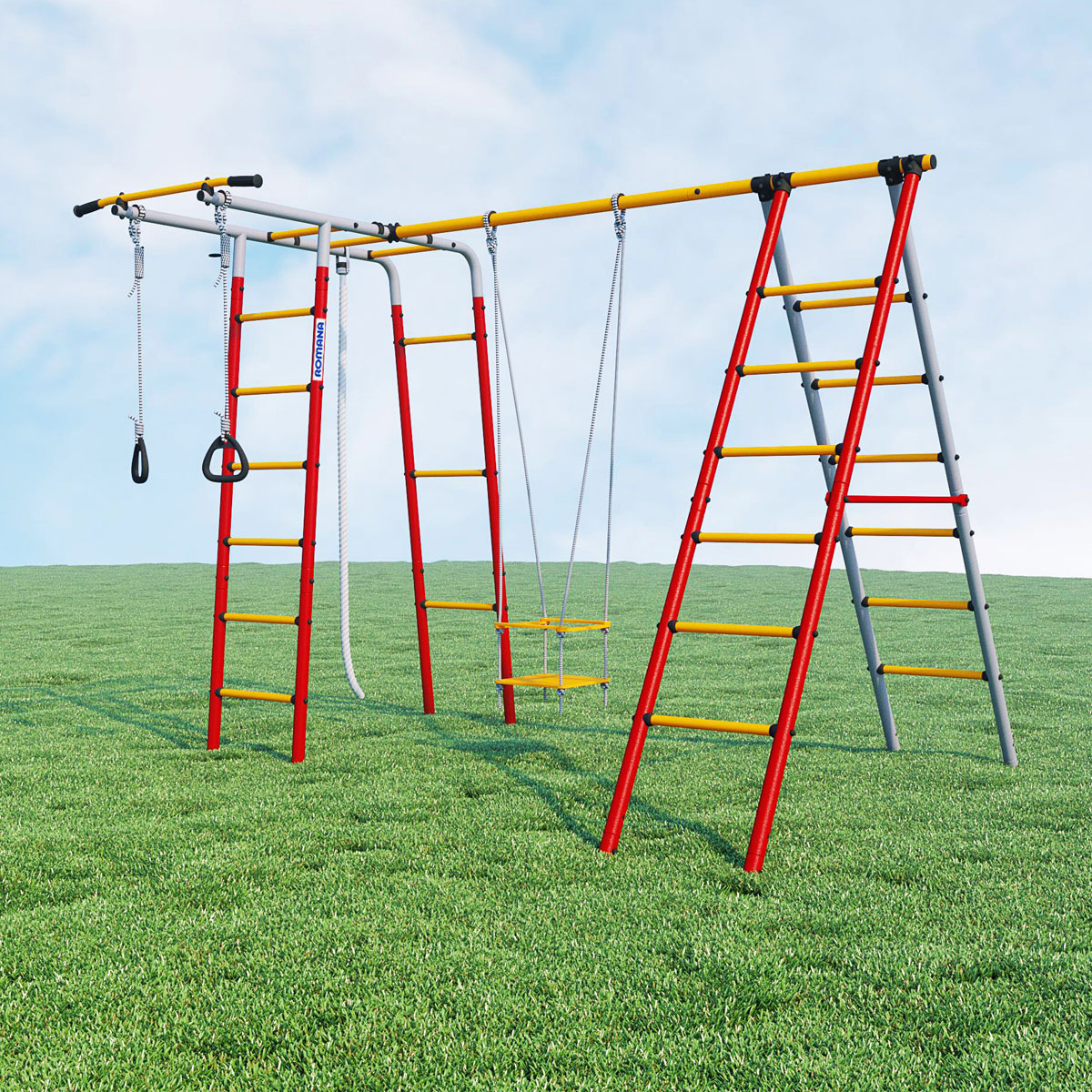 Дачный комплекс «Букварь». Конструкция позволяет легко перевешивать дополнительное навесное оборудование, каждый раз создавая новые игровые зоны, заменять навесы по мере роста и смены интересов ребенка. Играя на детском спортивном комплексе «Букварь», дети укрепляют мышцы, развивают ловкость и физическое здоровье. В комплекте: 4 лестницы гимнастические, перекладина, рукоход, турник, кольца гимнастические, канат.